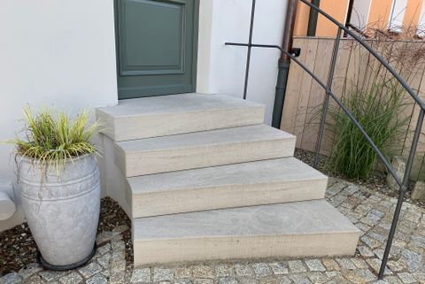 Naturstein für Böden und Treppen im Innen- oder Außenbereich – dauerhaft, pflegeleicht und formschön umgesetzt.